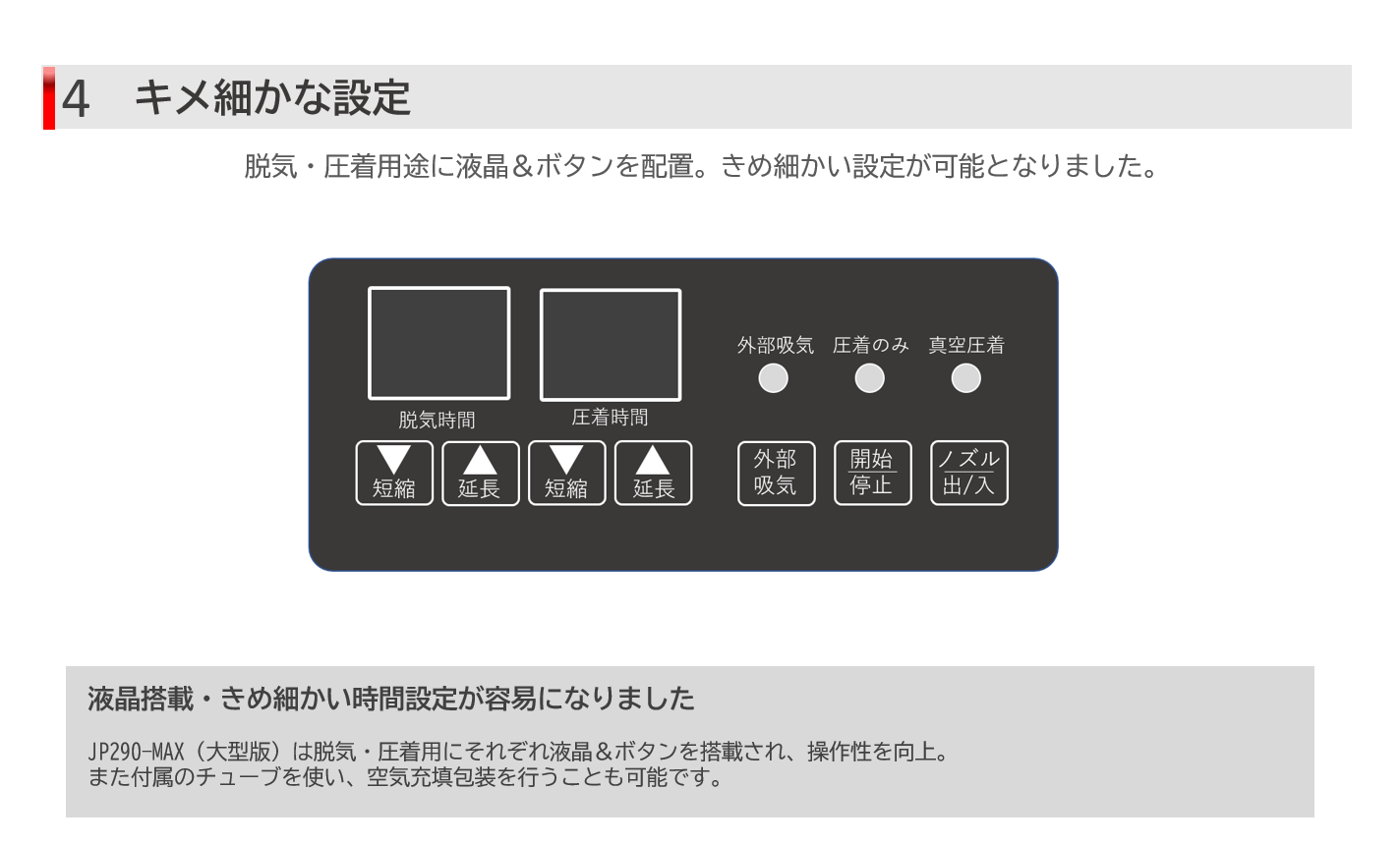 ■特徴:乾・水・粉・油物対応。長時間連続シール対応。軽量x省スペース。高耐久設計。吸引力最大80Kpa。さらに圧着幅8mmで確実密封。