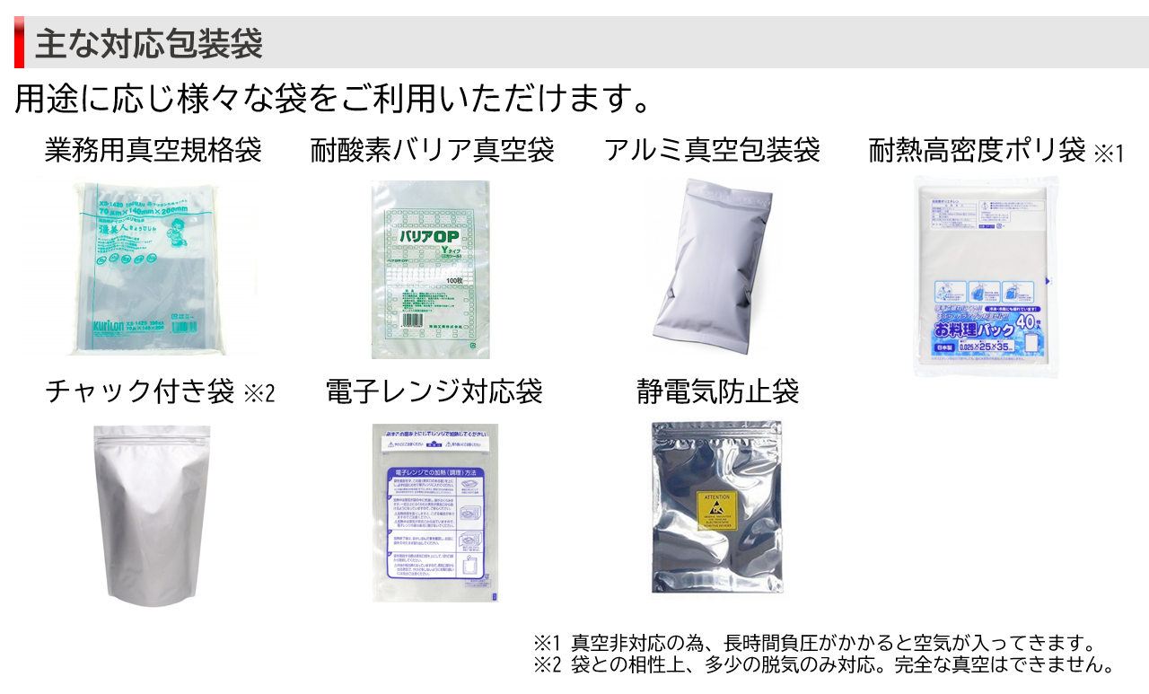 ※ガゼット袋並びに熱圧着を前提としていない袋(一般的な紙袋等)脱気不可、圧着不可です。